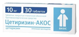 Цетиризин-АКОС — противоаллергический препарат для системного применения, содержащий в качестве активного вещества цетиризина дигидрохлорид. Это блокатор периферических H1-гистаминовых рецепторов, относящийся к группе конкурентных антагонистов гистамина. Таблетки покрыты пленочной оболочкой, что облегчает проглатывание и может маскировать неприятный вкус.